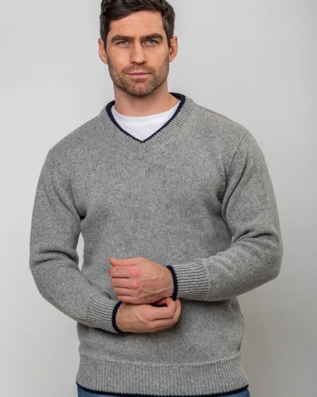 Made of a blend of Extra Fine Merino Wool & Cashmere this is a luxury sweater available in this stunning silver colour – Featuring a navy trip on neck and hem and a v neckline this beautiful sweater is super soft and cosy.Hand wash Only.