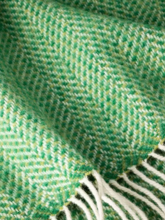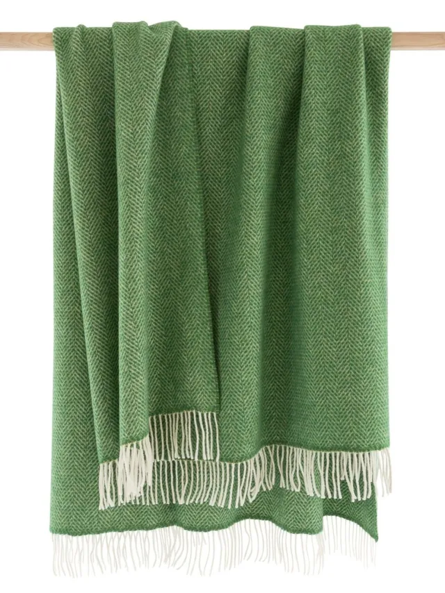 Cashmere Throw Green Herringbone. Made with a blend of Cashmere and Merino wool. A truly soft and luxurious throw with a vibrant colour palette across the collection. 95% Merino Wool 5% Cashmere.Size: 136 x 180cm (54 x 71”)Made In Ireland