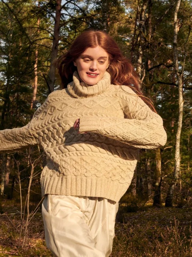 Our new Designer Cable knit Poloneck is a must have this season, it is the perfect cold weather go-to. Our riff on a classic, our Designer mixed several cable patterns to create interesting texture and dimension giving off a luxury, elegant feel. Featuring super soft yarn and a cozy wide turtleneck, this medium weight knit has a relaxed fit with a drop shoulder and boxy shape, perfect to style with a skirt or trousers.DetailsAvailable in classic Natural and BeigeKnit with 100% Fine Merino woolRibbed turtleneck, hem and cuffsModel wears a size Small