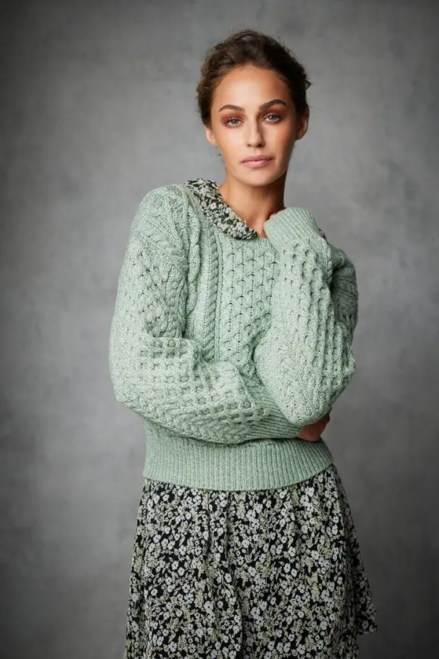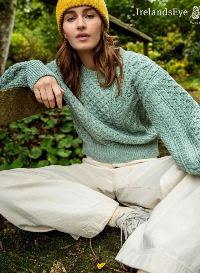 Made in Dublin, Ireland this stunning new cropped aran sweater is available in a collection of bright and vibrant colours.This 100% Merino wool style is a cropped, crew neck Aran with generous sleeves and an Aran pattern of gentle moss, honeycomb and cable stitchesOffered in sizes XS – XXL. Model is 5’10 and wears size S.Hand wash in lukewarm water, do not bleach, do not tumble dry, dry flat, reshape while damp, warm iron, store folded in cool, dry place.
