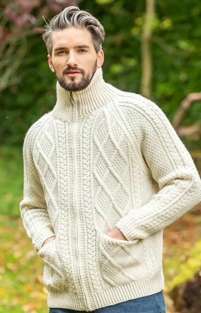 Aran Hand knit full zipper cardigan jacketThis warm men’s Aran cardiganis hand made and is available in navy blue, natural white, charcoal grey and beigeis made in Ireland and is 100% Soft Merino Wool. It’s easy fit will make you feel at home and those ample patch pockets are extremely functional. It is ideal for any man who enjoys the outdoors – it is guaranteed to keep you warm and cosy this winter. Product code:S156Premium quality Fall Winter Irish sweaterin a soft cosy merino wool is comfortable and snugWoven with diamond stitchingCertificate of Authenticity includedDelivery time 2-10 working days(Irish Post)