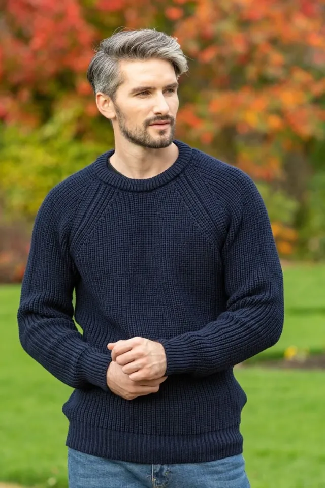 This mens ribbed crew neck is made of 100% merino wool. It is a classic sweater that has come back into fashion. The navy compliments the sweater and brings out its beautiful stitching. We suggest wearing with one of our soft wool scarves and an irish cap to keep you toasty and stylish this Winter!
