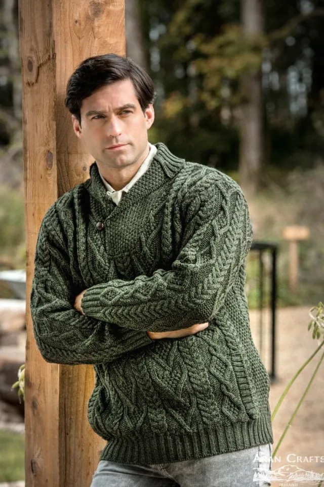 Men’s Aran Cowl Neck SweaterOur bestselling Men’s Irish sweater!This trendy Irish Aran Cowl Neck sweater, available in natural, green and navy, is made in Ireland and is 100% Soft Merino Wool. True Aran sweater for the modern man, this cowl neck Irish sweater is a wonderful addition to any man’s wardrobe. Cosy yet practical, this jumper would definitely make the perfect gift for the man in your life. “V” neck shawl collar is the main feature of this Irish sweater – team it up with a shirt underneath or a polo neck for extra warmth!Use of the herringbone stitch along the body and the length of the arms is further linking this garment with times gone by.This Irish Aran merino soft wool sweater is completed with the use of an old style button closure.The diamond knitting pattern along the body is said to represent wealth and success. The traditional cable pattern symbolising fisherman’s ropes unite the past with the modern day.Dry clean or handwash highly recommended