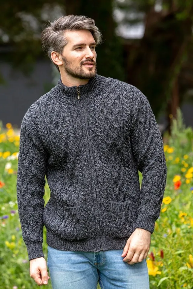 Mens Knitwear|Mens Aran Cardigans*Sweater Shop Men’s Merino Wool Full Zip Aran Cardigan