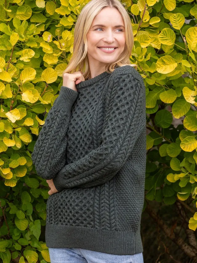 Womens Aran Fisherman Sweaters*Sweater Shop Unisex Merino Wool Aran Sweater Army Green