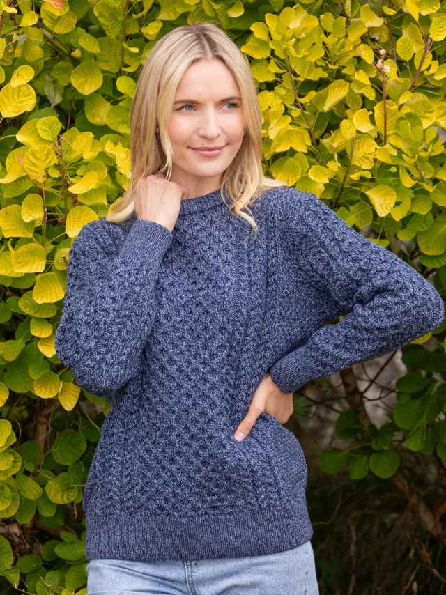 This 100% Merino wool sweater is super soft, super warm and extremely stylish to wear all year round. It has beautiful delicate Aran stitches throughout the front and back, with the traditional cable knit stitch featuring heavy,A traditional Irish sweater is something that never goes out of fashion – wear with your favourite jeans or with a skirt to take the sweater from day to evening wear. We love this colour – it is fresh, modern and so elegant!
