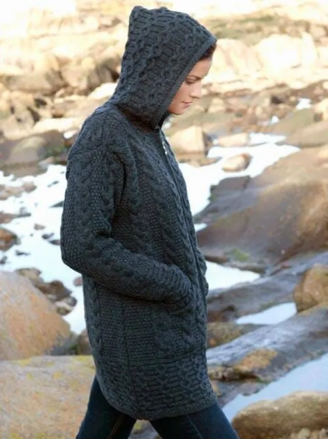 Womens Aran & Tweed Coats|Womens Irish Knitwear*Sweater Shop Irish Aran Hooded Coat Charcoal