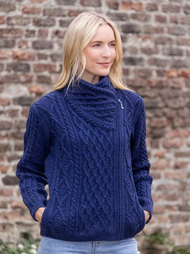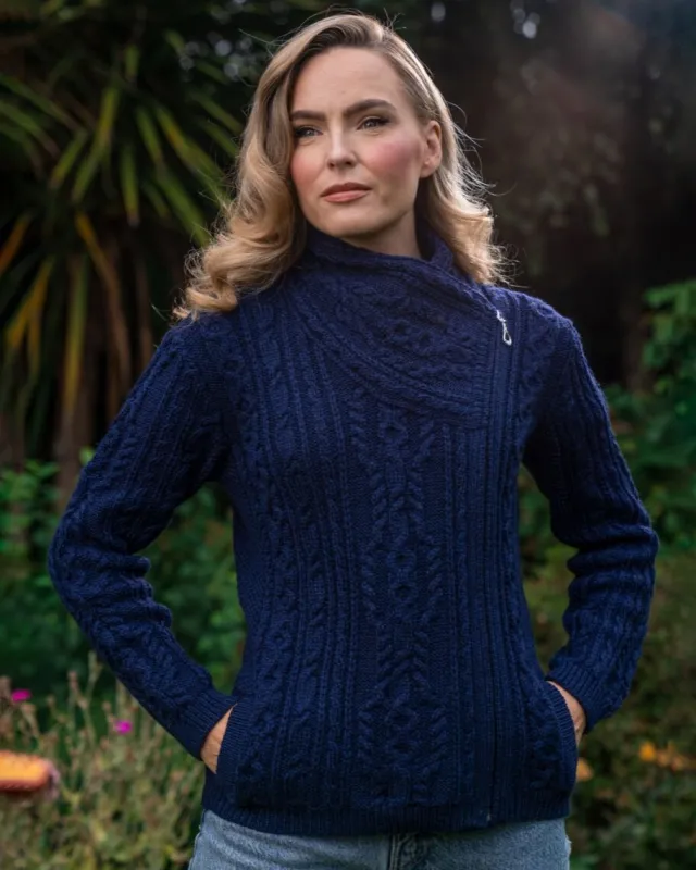 Womens Irish Knitwear*Sweater Shop Aran Cable Knit Side Zip Deep Water Blue
