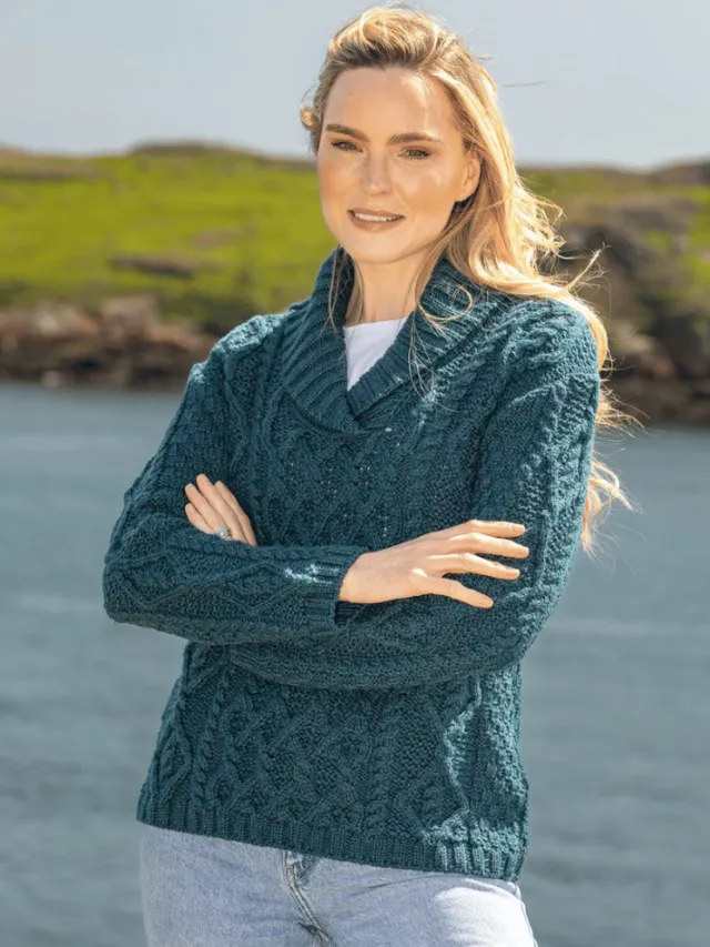 Womens Irish Knitwear|Womens Aran Fisherman Sweaters*Sweater Shop Bramble Aran Shawl Collar Sweater Atlantic