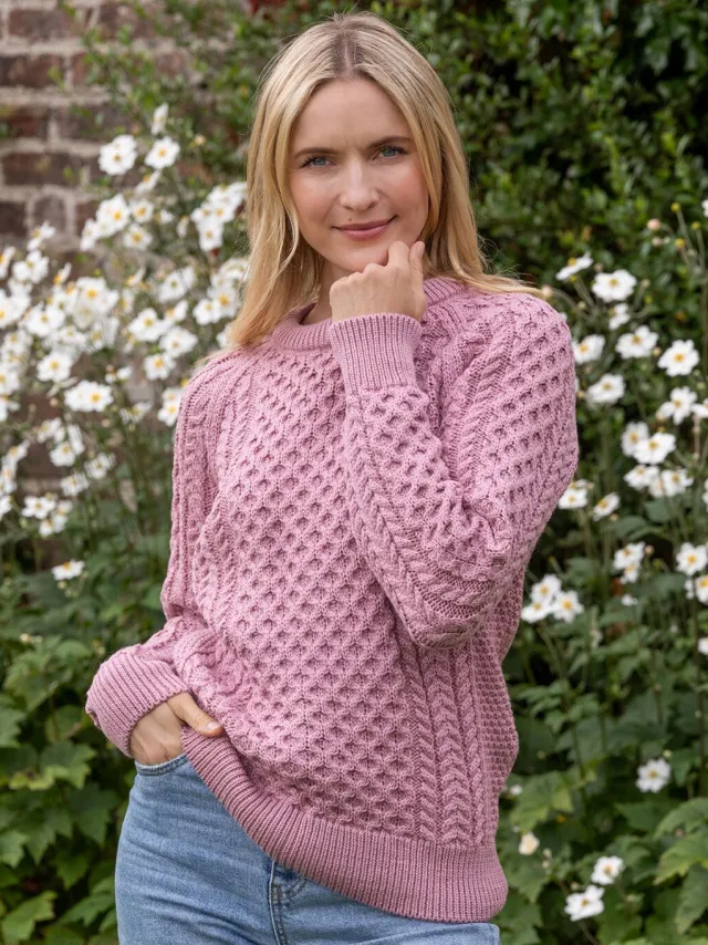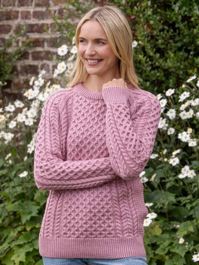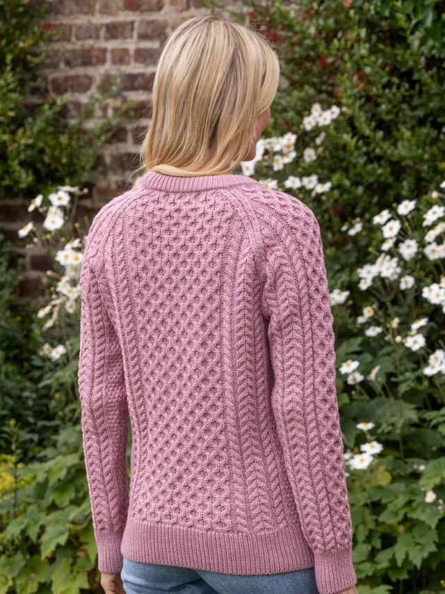 Womens Irish Knitwear|Womens Aran Fisherman Sweaters*Sweater Shop Ladies Merino Wool Fitted Aran Sweater Pink