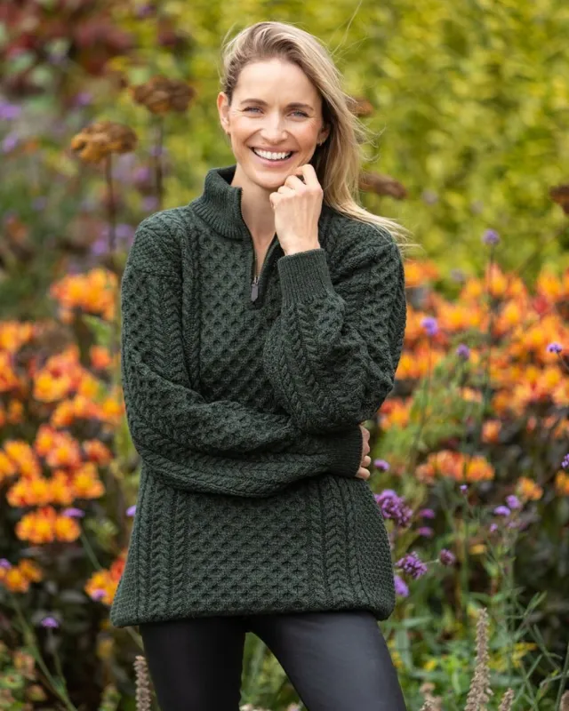 Womens Irish Knitwear|Womens Aran Fisherman Sweaters*Sweater Shop Unisex Half Zip Merino Wool Sweater Green Marl