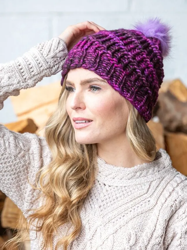 Aran Wool Hats|Ladies Hats*Sweater Shop Handmade in Ireland – Super Soft hat with pom pom- Purple