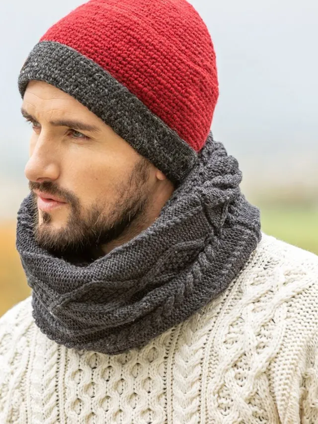 Aran Wool Hats|Mens Caps*Sweater Shop Mens Crochet Hat Red and Charcoal Rim