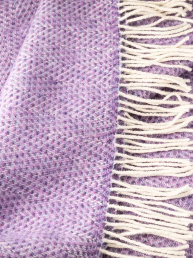 Cashmere Throw Lavender Purple Herringbone. Made with a blend of Cashmere and Merino wool. A truly soft and luxurious throw with a vibrant colour palette across the collection. 95% Merino Wool 5% Cashmere.Size: 136 x 180cm (54 x 71”)Made In Ireland