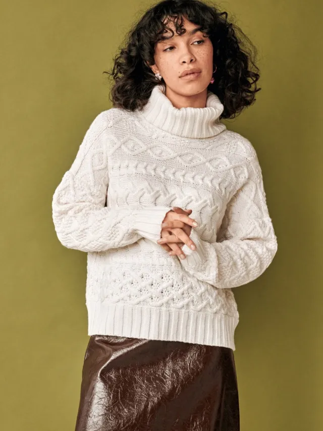 Our new Designer Cable knit Poloneck is a must have this season, it is the perfect cold weather go-to. Our riff on a classic, our Designer mixed several cable patterns to create interesting texture and dimension giving off a luxury, elegant feel. Featuring super soft yarn and a cozy wide turtleneck, this medium weight knit has a relaxed fit with a drop shoulder and boxy shape, perfect to style with a skirt or trousers.DetailsAvailable in classic Natural and BeigeKnit with 100% Fine Merino woolRibbed turtleneck, hem and cuffsModel wears a size Small