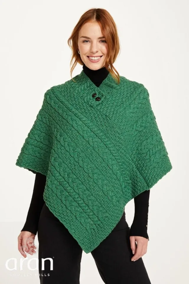 Ladies Aran Ponchos & Capes*Sweater Shop One Size Cable knit Poncho with Buttons Kelly Green