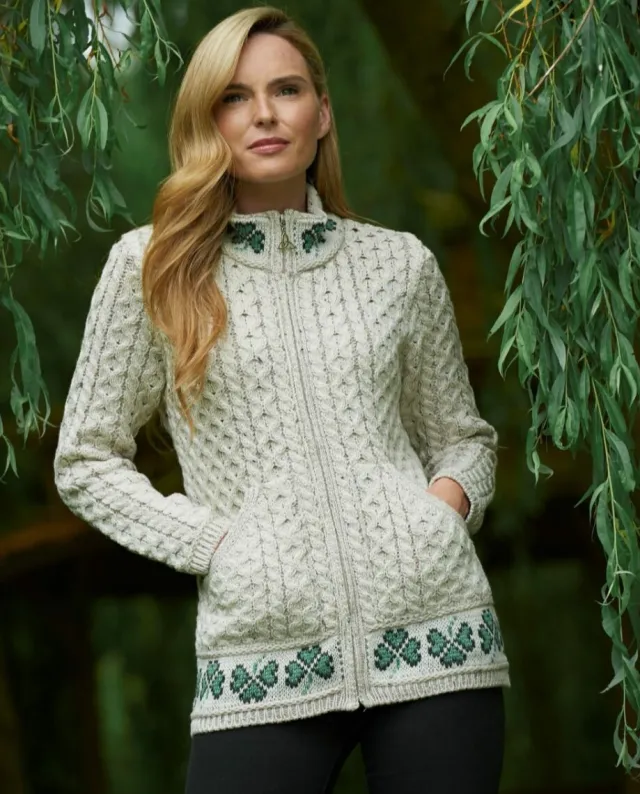Ladies Cardigans*Sweater Shop 100% Merino Wool Shamrock Zip Cardigan