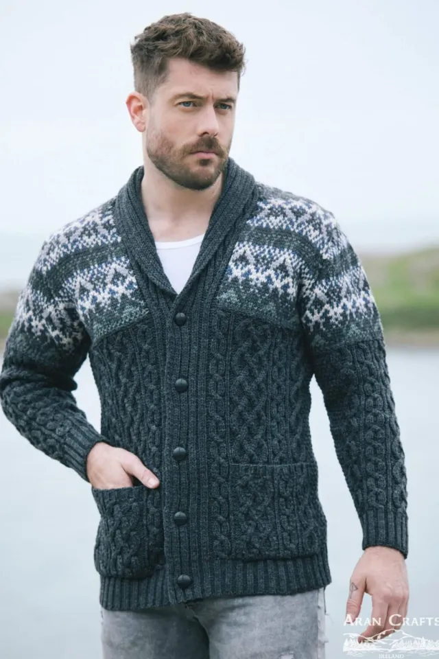 Mens Aran Cardigans|Mens Knitwear*Sweater Shop Fairisle Shawl Cardigan Charcoal