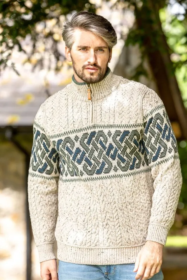 Mens Fisherman Sweaters|Mens Knitwear*Sweater Shop Aran Half Zip Sweater with Celtic Design