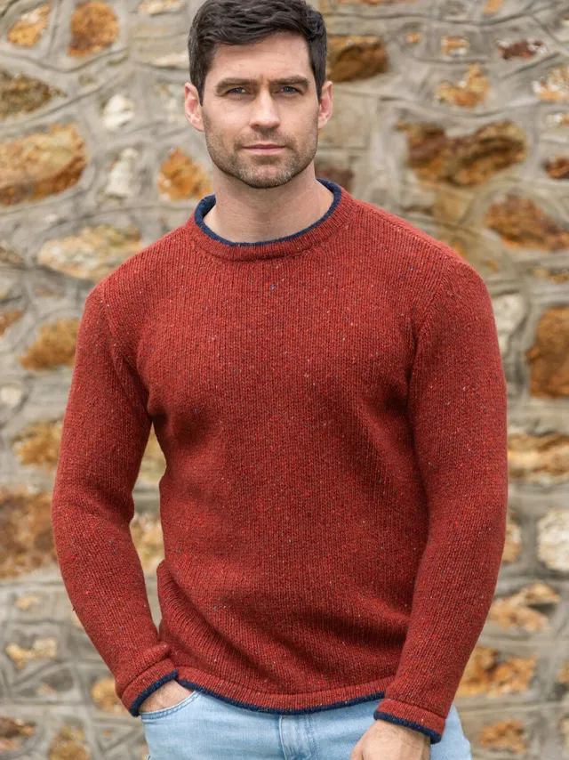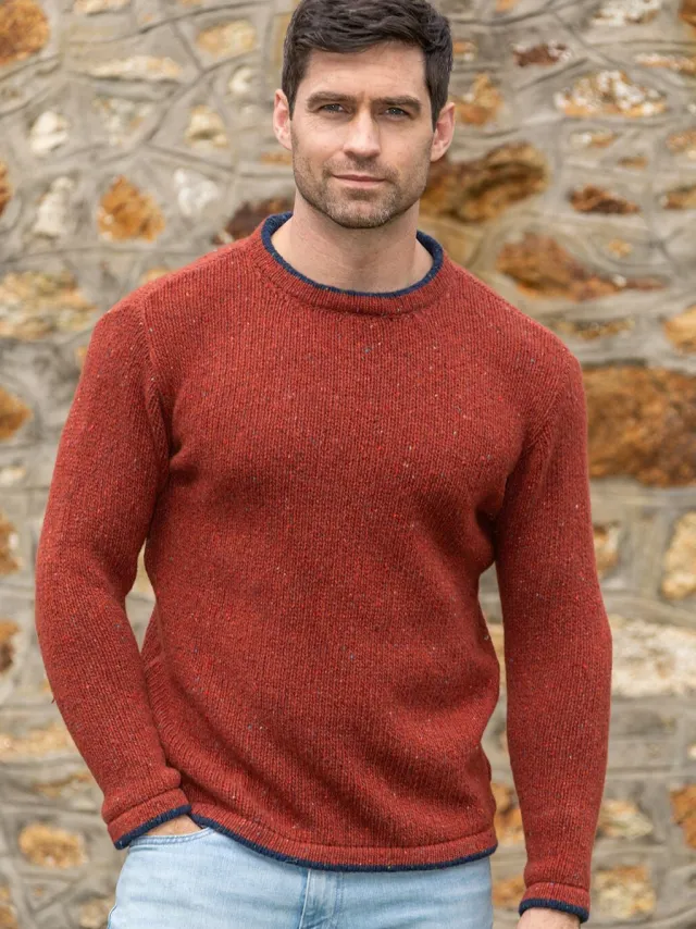 This mens crew neck sweater is made of soft wool (95%) and cashmere (5%), making it a favourite among our male customers. It is made in Dublin by a fellow family business- Irelands Eye knitwear. It is soft, cosy, warm and extremely fashionable to wear.It is a hard wearing sweater so it is so versatile and can be teamed with jeans for a casual daytime look or with a shirt at night for evening wear. It is sure to keep you looking good at warm at the same time!Available in a variety of colours including green marl ,navy and sky blue – all feature beautiful faint colour specks throughout, making this a sweater with a difference! The quality of this Irish sweater is truly incredible and will last a lifetime.-Crew neck sweater with contrast tipping-Set in sleeves-A great gift for any man-Delivery time 2-10 working days (Irish Post)