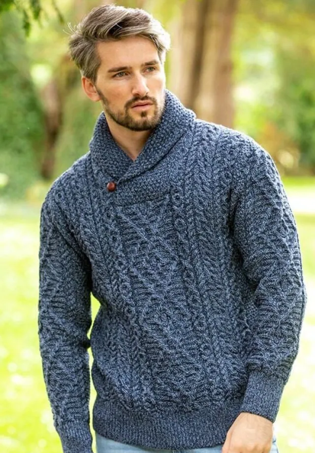 Protect yourself from the bone-piercing winter cold with the Aran Shawl Neck Sweater. This men’s sweater is made of pure soft Merino wool, which will help you stay warm and toasty even on the coldest days.The sweater is manufactured in Ireland and showcases superb Irish craftsmanship with herringbone stitching down the torso and arms, not to mention the diamond knitting pattern that has long been believed to signify success and wealth.In terms of style, this Irish fisherman’s sweater is nothing short of outstanding. It has a V-neck shawl collar and would look great with a polo neck or a shirt underneath. The sweater’s classic button closure completes the look, adding to the sweater’s overall trendy appeal.As for the colour, this cardigan comes in a denim hue that will go well with any man’s outfit. It is, however, available in various colours, including deep water blue and army green.Among the qualities that distinguish the Aran Shawl Neck Sweater are:V-neck shawl collar with antique button fastening for a polished lookPure soft Merino wool to provide optimal comfort and warmthElegant Irish craftsmanship guarantees durability and qualityA denim colour that goes with any outfit