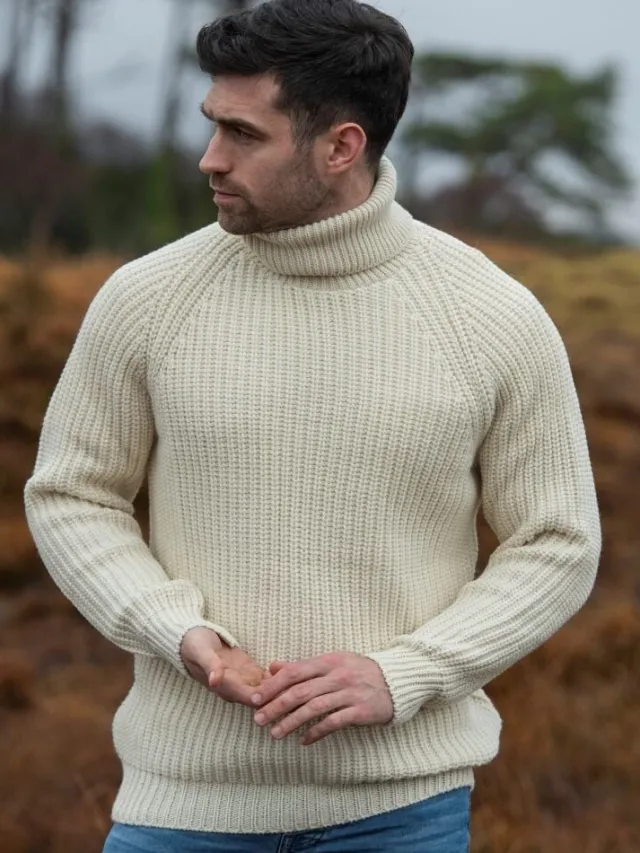 Mens Knitwear|Mens Fisherman Sweaters*Sweater Shop Men’s Rib Roll Neck Sweater Natural
