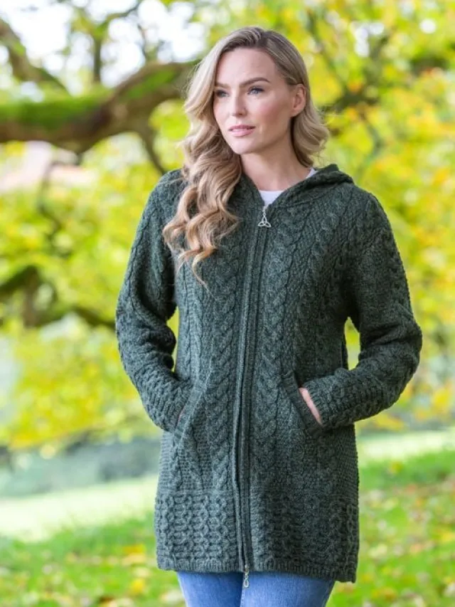 Womens Aran & Tweed Coats|Womens Irish Knitwear*Sweater Shop Irish Aran Hooded Coat Army Green