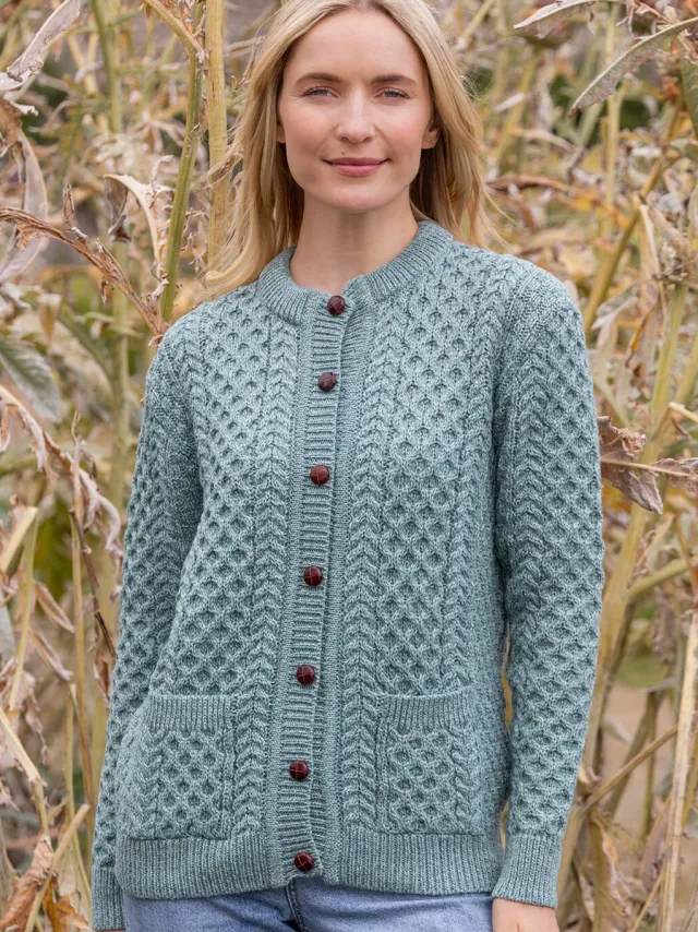 Womens Irish Knitwear|Ladies Cardigans*Sweater Shop Ladies Cable Knit Cardigan Aqua