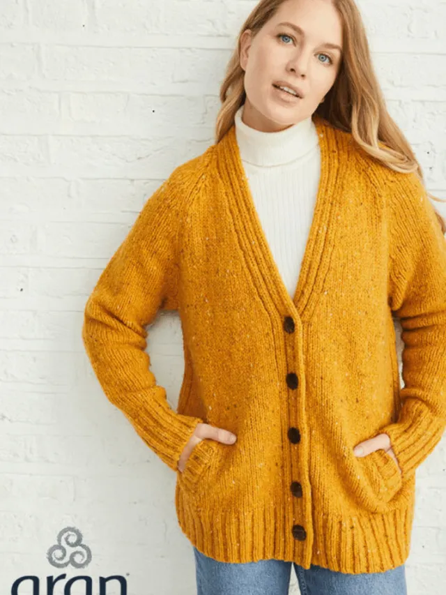 This stunning cardigan is made in Westport in Ireland by the infamous Aran Woollen Mills. It is made of 100% donegal yarn, making it warm, cosy and so soft to wear.Wear as a layering piece over a favourite shirt and jeans and high tops. It also works well over a denim or tea dress. A great wardrobe staple. Available in yellow, denim and a stunning pink.The plain knit highlights the coloured nepps in the yarn, providing a tweed-like look.The fit is loose and easy, boyfriend cosy, in a slightly longer length than standard.Hand wash or dry clean.