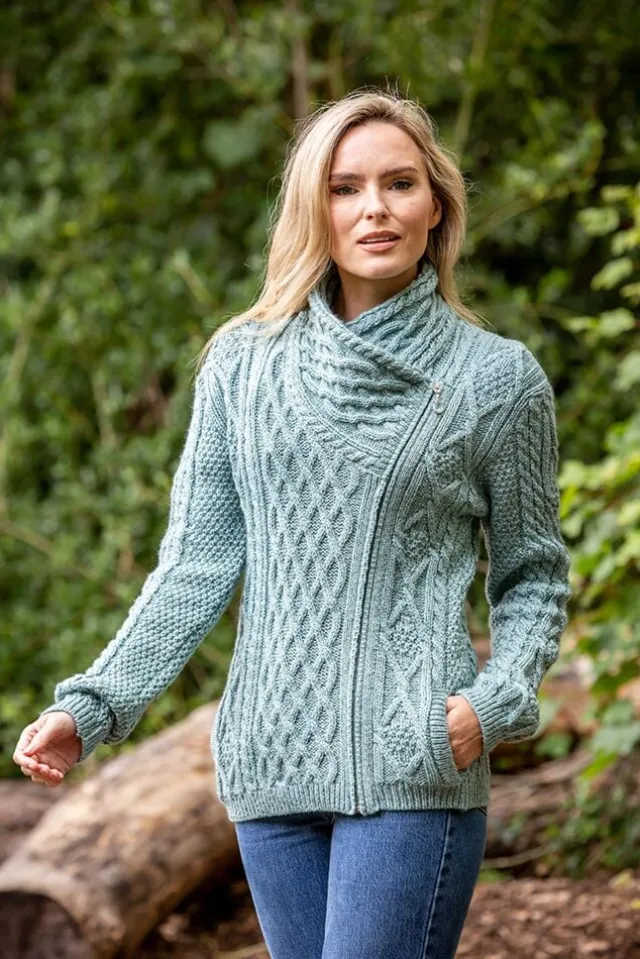 Womens Irish Knitwear|Ladies Cardigans*Sweater Shop Side Zip Cable knit Sweater with Claddagh Zip