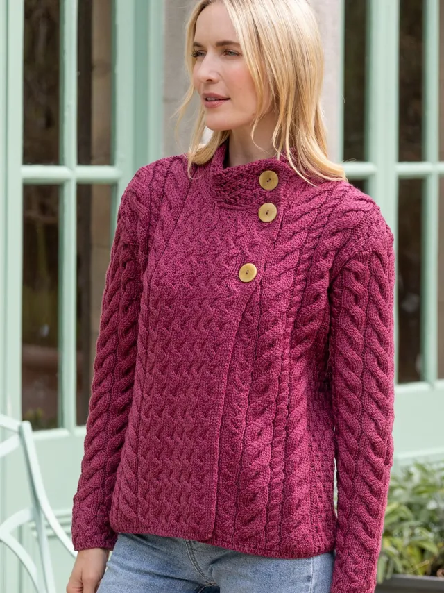 Womens Irish Knitwear|Ladies Cardigans*Sweater Shop Super Soft Aran Button Cardigan Rose