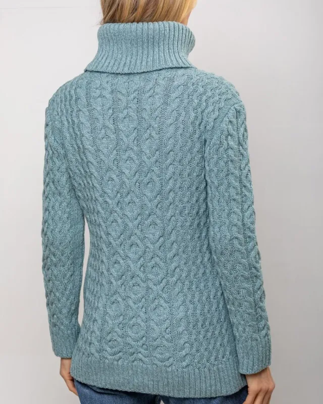 Womens Irish Knitwear|Womens Aran Fisherman Sweaters*Sweater Shop Aran Cowl Neck Merino Wool Aqua