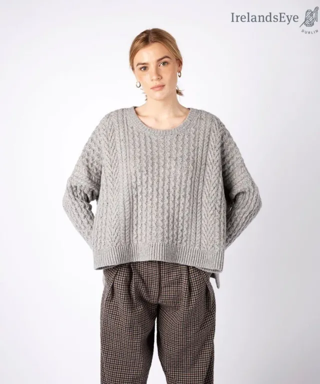 The Sorrel Aran Sweater is a long sleeve cropped crew neck sweater with an Aran pattern and side slits . This sweater is made from a blend of wool, cotton, cashmere and silk. Hand wash in lukewarm water, do not bleach, do not tumble dry, dry flat, reshape while damp, use a warm iron, and store folded in a cool, dry place. Founded in Dublin in 1988, IrelandsEye is a family-run company making knitwear for over 30 years. Inspired by the Irish landscape and the colours of nature, they combine a traditional Irish knitwear heritage with their own unique twist. Designed and made in Dublin, each piece is crafted using 100% natural yarn, carefully finished by hand.Please note this style is big fitting.