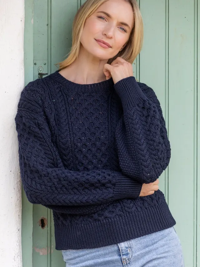 Womens Irish Knitwear|Womens Aran Fisherman Sweaters*Sweater Shop Honeysuckle Cropped Aran Sweater Navy