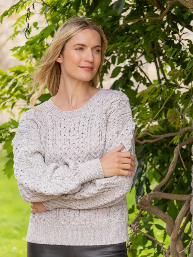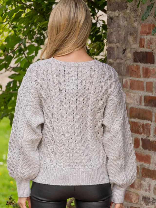 Womens Irish Knitwear|Womens Aran Fisherman Sweaters*Sweater Shop Honeysuckle Cropped Aran Sweater Silver Marl