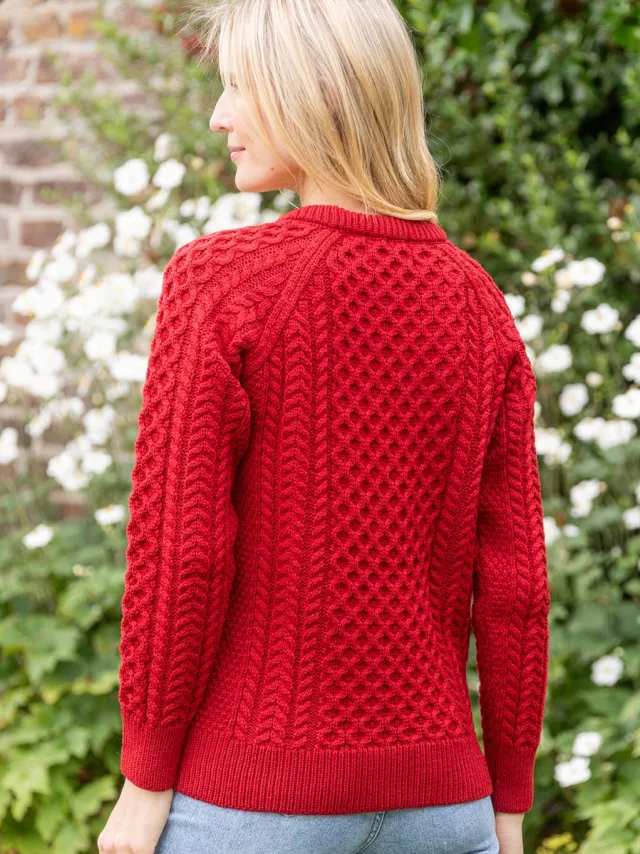 Womens Irish Knitwear|Womens Aran Fisherman Sweaters*Sweater Shop Ladies 100% Merino Wool Aran Sweater Red