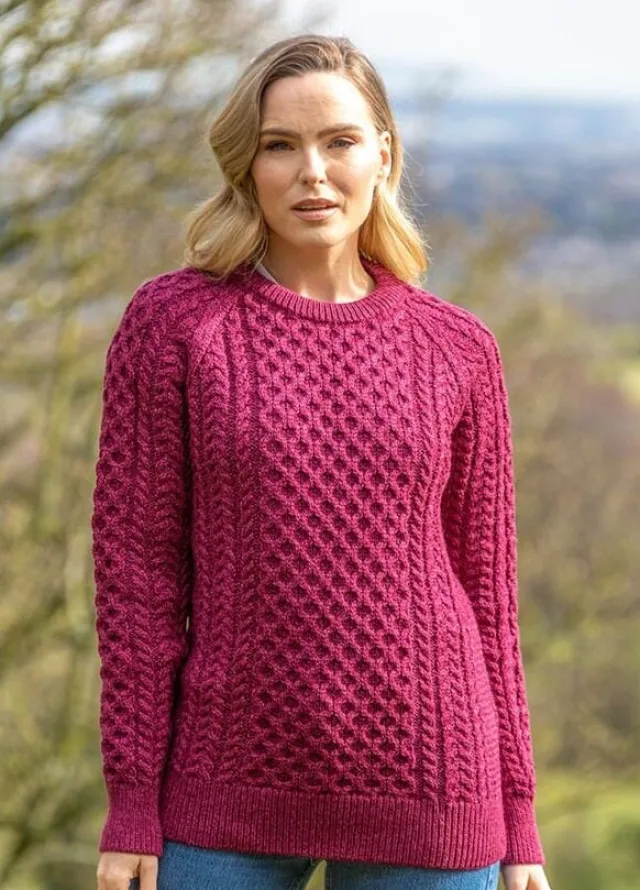 Womens Irish Knitwear|Womens Aran Fisherman Sweaters*Sweater Shop Ladies Merino Wool Fitted Aran Sweater Raspberry