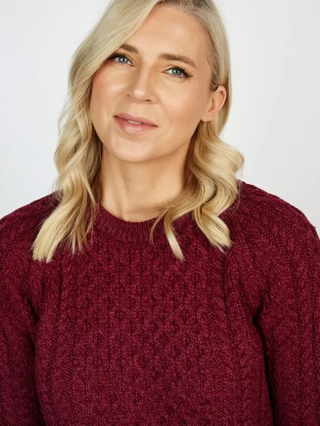 This contemporary ladies sweater takes on the classic style and spots the beautiful Aran cable knit stitching down the back and front. It also has an array of other stunning Irish stitching, which makes it stand out. Made from 100% merino wool, this jumper guarantees premium comfort and warmth.Add a pop of colour to your wardrobe with this raspberry colour which is feminine, elegant, and sophisticated. It can be paired with denim jeans for contrast and one of our pink merino wool scarfs for that bold look.If you have sensitive skin, this garment is a perfect choice since wool is inherently hypoallergenic. You’ll also stay dry all day, thanks to wool’s moisture—wicking properties. Compared with sweaters made from other synthetic materials, this sweater will last long due to the complex structure of wool fibres.This sweater has raglan sleeves that create a wider underarm area for a more fitted look. Everyone has a pick since this sweater is available in extra small to extra large sizes. Other notable features of this garment include:Offers protection from UV rays100% wool promises exquisite comfortThe Aran stitching adds a touch of sophisticationThe antibacterial properties of wool ensure you stay fresh all day