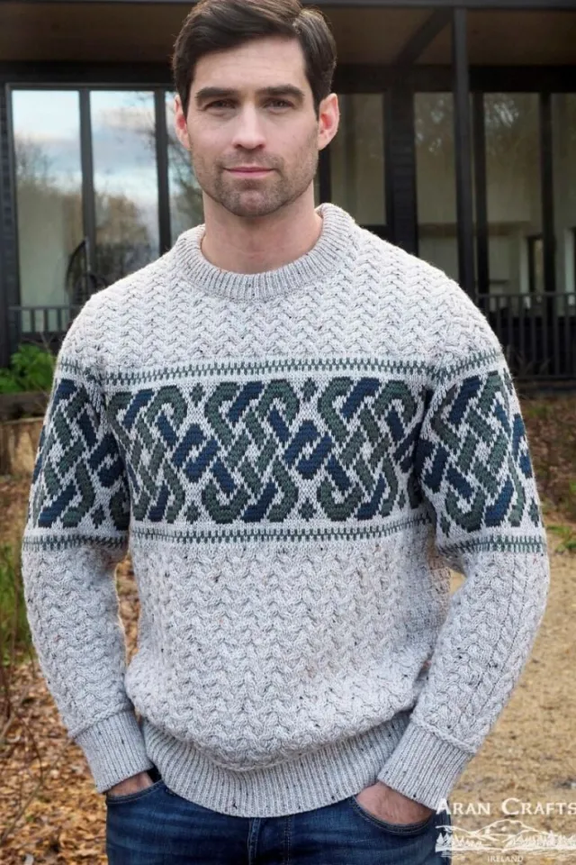 Made from 100% Merino WoolCharming unisex crew neck sweater with Celtic Jacquard design. The addition of the Jacquard design around the sweater gives this traditional crew neck cable sweater a striking stylish feature. The Jacquard is knit using contrasting colours which compliment the garment beautifully.Colours available: Oatmeal, Army Green & CharcoalSizes Avaiable: Small -XXLarge